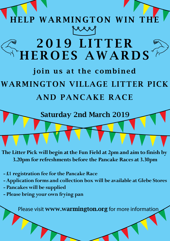 Help Warmington win the 2019 Litter Heroes Awards by joining us at the combined Warmington Village Litter Pick and Pancake Race on Saturday 2nd March 2019.